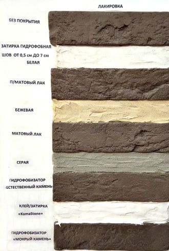Лакировка дает защиту поверхности камня от грязи и внешних воздействий при эксплуатации и в случае контакта с водой. При нанесении глянцевого лака или пропитки на плитку появится блеск и блики от освещения, цвет камня станет насыщеннее и темнее. Матовый лак сохранит бархатной поверхность камня, кирпича. Полуматовый лак занимает среднее положение между матовым и глянцевым. Большинство клиентов выбирает матовую лакировку, но тут все зависит от разработанного дизайна, в котором будет применен декоративный камень.